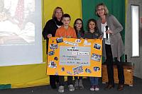 Nele, Meret und Henning aus der Klasse 4a überreichen gemeinsam mit Frau Topp einen symbolischen Scheck in Höhe von 3421,70 € an Frau Theissen (SOS-Kinderdörfer).