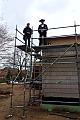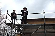 Traditionen haben in Worringen einen hohen Stellenwert und so bestiegen Architekt Güsgen und Zimmermann Wildt „den Berg“, um dem Anlass gebührend einen Spruch zum Besten zu geben. Ein entleertes Schnapsglas, das anschließend an der Mauer zersplitterte, besiegelte die guten Wünsche für die neu entstehende KiTa am Evinghover Weg.