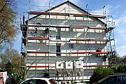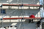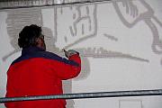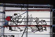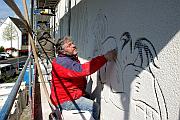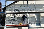 Freitags früh wurden schließlich die ersten 3 x 5 m großen Motive mit historischer Handarbeit aus dem Putz gekratzt. Die Wurzeln der „Sgraffito-Technik“ reichen bis ins 13. Jahrhundert zurück. Die Firma, die diese Arbeiten ausführt, ist auf die Erhaltung historischer Gebäude spezialisiert und kombiniert alte Handwerkstradition mit modernster Technik und aktuellen Materialien. Bereits in zwei Wochen soll schon der zweite links liegende Häuserblock mit dem Motiv der „Sieben Schwaben“ fertiggestellt sein. Weitere Motive sind wegen der anders gebauten Giebel und des möglichen Vandalismus nicht geplant.