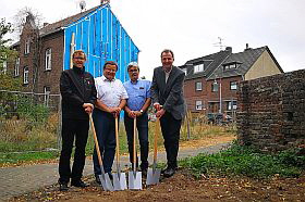 Spatenstich vor dem Grundstück des abgerissenen Jugendheims, von links: Peter Krücker (Caritasverband), Günther Otten (stellv. Vorsitzender des Kirchenvorstands & Vorsitzender des Bauausschusses), Konrad Güsgen (Architekt), Thomas Wolff (Leitender Pfarrer und Vorsitzender des Kirchenvorstands)
