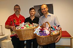 Köln-Worringen Sichtlich erfreut nahmen am Montag dieser Woche die neuen Kinderärzte Dres. Markus Treichel und Christoph Wilmes 110 Trostteddys aus den Händen von Uwe Stumpf entgegen. In zwei randvoll gefüllten Körben überreichte dieser die liebevoll in Strick handgearbeiteten Teddys in den Praxisräumen auf der Bitterstraße. Bei Bedarf können diese nun den Kindern nach ihrer Behandlung überreicht werden.
