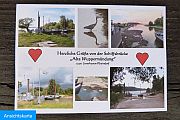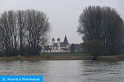 Hier angekommen sieht man eine große Schar von Schwänen und vielen Wasservögeln. Es gibt noch einen Spielplatz und einen großen Biergarten. Ein kleiner Abstecher zum Hitdorfer Hafen ist vielleicht auch noch drin, aber unser Ziel ist ja weiter rheinaufwärts. Ein schöner Weg führt hier durch das Landschaftsschutzgebiet. Unterwegs sehen wir auf der anderen Rheinseite die Rheinkasseler Romanische Kirche St. Amandus. Unser Weg biegt vor der heutigen Wuppermündung nach links ab und führt unter der A59 hindurch. Einen Kilometer weiter landeinwärts mündet die Dhünn in die Wupper. Der Berg vor uns ist die Mülldeponie des Chempark Leverkusen. Eine 40 m tiefe Wand im Boden trennt die Deponie vom Rhein. Wir fahren über die Wupperbrücke weiter unter der Autobahn durch und halten uns nach rechts in Richtung Schiffsbrücke.
