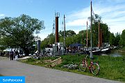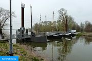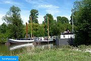 Die neue Schiffsbrücke besteht seit 2012 aus der Tjalk "Freiheit " dem Aalschocker "Recht" und einem Ponton in dem die umfangreiche Technik untergebracht ist. Aalschocker lagen früher auch im Worringer Hafen. Der letzte seiner Art, lag bis vor wenigen Jahren gegenüber der Jet-Tankstelle zwischen B9 und Hafen auf Land. Vor dem Krieg gab es an der Wuppermündung schon Holzbohlen und Eisenpontons als Übergang. Nach dem Krieg wurden dann drei Plattbodenschiffe an einander getaut, auf denen der Besitzer Heinrich Gless eine Gastronomie betrieb. 1983 wurde die Anlage in die Denkmalliste aufgenommen und war ein beliebtes Ausflugsziel, bis sie dann später langsam verfiel. Engagierte Bürger gründeten einen Förderverein und sammelten 2 Millionen Euro. Sie bauten die Anlage wieder neu auf. Heute kann man hier wieder bei einer kleinen Gastronomie eine Pause inmitten des grünen Fächers von Leverkusen machen.