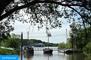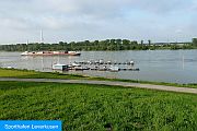 Auf der anderen Rheinseite liegt der Hitdorfer Hafen, heute gibt es hier mehrere Sportbootclubs. Zwei Kräne erinnern noch an den früheren Industriehafen für die Region Solingen und Wuppertal. Hier pendelten schon vor 400 Jahren Boote zwischen Langel und Hitdorf mit Menschen und Fracht über den Rhein. Auf beiden Seiten sind auch die beiden Natorampen zu sehen. Früher wurden hier regelmäßig von den Pionieren der Bundeswehr mit Schwimmpontons eine Brücke gebaut und Fahrzeuge übergesetzt. Auf der Langeler Seite dient die Rampe als Parkplatz und Slipanlage für Boote. Wer will kann auch bis hier her mit dem Auto fahren und dann auf der anderen Rheinseite zu Fuß zur Schiffsbrücke wandern, knapp 6 km Hin- und Rückweg.