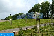 Sehenswert ist noch die Außenfassade am Pumpwerk in Langel. Je nach dem aus welcher Richtung man sieht, wechselt das Bild in eine einfarbige Fläche.