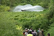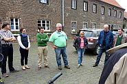 Hier empfingen uns Leonie & Georg Kellerwessel, die den Hof von der Stadt Köln gepachtet haben, mit einem Frühstück. Sie betreiben hier eine Pferdezucht mit Pension. Ganz stolz sind sie auf ihre Rinderzucht: Blonde d`Aquitaine. Diese Rinder haben ein Cholesterin armes Fleisch. Sie betreiben einen schonenden Ackerbau ohne Pflug. Der Boden wird nur aufgekratzt oder gegrubbert. Wir konnten eine Mulchsaatmaschine, einen Mähdrescher mit Raupenantrieb und eine Pfanzenschutzmittelspritze mit Satelliten (GPS) gesteuertem Traktor sehen. Die Dosierung wird damit optimal minimiert. Hier im Kölner Norden rund um das Wasserwerk Weiler ist dies besonders wichtig. Einmal pro Woche trifft sich der Arbeitskreis der hiesigen Landwirte mit der Rheinenergie und der Landwirtschaftskammer, um weiteres Vorgehen und eventuellen Schädlingsbefall zu besprechen.