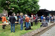 Der Weg führte über Heimersdorf. Hier feierte der Haselnußhof sein 50 jähriges Bestehen. Der Siedlerverein hatte ein schönes Fest ausgerichtet und viele Heimersdorfer waren mit dabei. Am Fühlinger See bestiegen wir den Zielturm. Hier erläuterte Herr Röhricht vom Förderverein Fühlinger See und Frau Brinkhaus vom Sportamt der Stadt Köln die Geschichte des Sees. 1912 wurde viel Kies für die Köln Aachener Eisenbahn gebraucht und so begann man auf dem Gelände des Grafen Oppenheim, der hier eigentlich eine Pferderennbahn bauen wollte, was aber wegen der vielen Kaninchen nicht ging, mit der Auskiesung. Zwischenzeitlich war hier auch eine Versuchsstrecke der Allwegbahn. Sie kam aber nie zur Serienreife. Schon Konrad Adenauer sprach von einer Ruderregattastrecke für Köln. Aber erst in den 60er Jahren begann die Planung für eine Regattastrecke durch Zusammenlegung der Seen in Fühlingen. 1978 war dann die erste Rudermeisterschaft über 1000 m. Auf den Betonplatten, die Belgische Streitkräfte hier angelegt hatten, wurden dann die Hallen gebaut. Heute gibt es am See auch Festivals und andere Veranstaltungen.