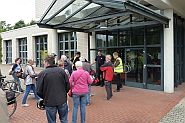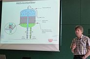 Stefan Schiffmann von der Rheinenergie erklärte uns die Wasserwirtschaft hier in Weiler. Das Wasserwerk (besteht seit 1931) wurde mehrfach umgebaut und die Technik angepasst. Heute fördert eine Brunnengalerie aus 31 Brunnen, die in einer Kette von 2 mal 1 km Länge angeordnet sind, das Grundwasser. Es wird in 2 Infiltrationsbecken mit Uferfiltrat aus Langel angereichert. Die Wasserschutzzone erstreckt sich von Bergheim bis Worringen / Langel. Nitrat und Pflanzenschutzmittel sind kein Problem für das Wasserwerk. Der Arbeitskreis Wasser und Landwirtschaft achtet darauf. Die Landwirtschaft düngt viel mit Zwischenanbau von Senf und Ölrettich als Mulchdüngung, parallel zur Substratdüngung, die heute hier bei uns ohne Geruchsbelästigung eingebracht wird. Viele Probestellen zeigen schon Jahre im Voraus Veränderungen an. Der Wasserpreis ist verglichen mit unserem Einkommen sogar um die Hälfte gefallen. Dat Wasser von Kölle is joot. Wir konnten es vor Ort probieren und eine Flasche für die weitere Tour mitnehmen.
