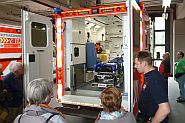Hier führte uns Herr Michael Christian durch die Feuerwache 6. Stationiert sind hier drei Rettungstransportfahrzeuge, ein Notarztwagen und drei Feuerwehrfahrzeuge, darunter eine Drehleiter und ein Tanklöschfahrzeug. Ein viertes Rettungstransport- fahrzeug steht in Esch und wird demnächst in Worringen stationiert. 70 Personen arbeiten hier im Schichtrhythmus in den verschiedenen Einsatzbereichen. Weiteres Personal wird noch eingestellt. Zurzeit ist eine Frau in der Ausbildung. Ein Notarzt ist immer in der Wache. Derzeit wird eine 2. Wagenhalle für Reservefahrzeuge und ein Boot gebaut.