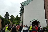Hier besuchten wir die Kirche St. Amandus in Rheinkassel. Diakon Matthias Gill von der Pfarrei Am Worringer Bruch begeisterte uns für dieses Kleinod. Die Kirche stammt aus dem Jahre 899 und gehörte um 1200 zu St. Gereon in Köln. Sie wurde mehrfach vergrößert und auch der Kirche von St. Gereon angeglichen. Amandus ist ein Belgischer Heiliger. Die Kirche liegt zwischen der Römerstraße, die die Verlängerung der Hohe Straße in Köln ist und weiterführt nach Neuss und dem Jakobspilgerweg, der hinter der Kirche über den Rheindamm führt. Hier gestaltet Diakon Gill jedes Jahr zu Ostern einen Kreuzweg in Wort und Bildtafeln. Bekannt ist die Kirche auch für ihr ökumenisches Valentinsfest für Verliebte, Verlobte und Verheiratete. Sie wird auch gerne für Hochzeiten genutzt, weil sie in ihrer Größe ideal ist.