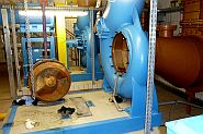 Herr Haubner von der STEB führte uns nach einer kleinen Erfrischung durch die Pumpanlage. Von außen sorgt eine Fassade mit Aluminiumlamellen für ein wechselndes Bild, entweder einfarbig Orange oder ein buntes Seerosenbild. Oberirdisch ist das aber nur die Schaltzentrale. Im Keller sichern 5 Pumpen a 1000 Liter/ h die Entwässerung mehrerer Stadtteile von Esch bis Langel und von Worringen bis Merkenich. Zudem fließt das gereinigte Abwasser der Kläranlage Langel dazu. Die Anlage stammt aus dem Jahre 1963 und wurde 2010 auf den heutigen Stand erweitert. Die Anlage wird bei einem Wasserstand von 5 m Kölner Pegel stufenweise zugeschaltet. Zwei Notstromaggregate sorgen für einen störungsfreien Betrieb bei Stromausfall. Die Überwachungszentrale ist in Köln Ostheim.