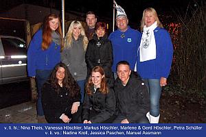 Doch von vorne: Gerd Höschler, kommender Prinz der Session 2013 musste zunächst einmal einen Schrecken verarbeiten, als das zuvor stundenlang aufgebaute Bierzelt dem vielen Regen nicht standhielt und in sich zusammenbrach. Doch woher so schnell ein Neues bekommen? Die Lösung hatte –wie so oft- die Feuerwehr parat und lieh das eigene Jugendfeuerwehr-Zelt aus. Nach dem ersten Schrecken klappte der weitere Aufbau von Getränketheke und Suppenausschank hervorragend. Pünktlich um 18 Uhr konnte Gerd Höschler daher mit Ehegattin Marlene und Nachwuchs Vanessa und Markus sowie dem zukünftigen Hofstaat geladene Gäste im Garten seines Hauses an der Alte Straße empfangen, um die Fahnen der Karnevalsgesellschaften, des Festkomitees und des Bürgervereins* (*erstmalig am 29.12.2009) hissen zu lassen.