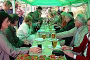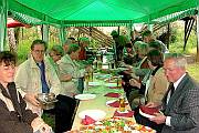 aufgetreten sein, bitten wir um Nachsicht. Weitere Ausführungen können in Dagmar Hötzels 2002 veröffentilchen Werk STADTSPUREN detailliert nachgelesen werden. Nach der Führung organisierte der Bürgerverein im Budgarten des Krebelshofs einen kleinen Imbiß, mit dem sich die Teilnehmer gerne stärkten. Bernd Jansen, Vorsitzender des Bürgervereins sorgte fleißig für Nachschub der Leckereien. Bei einem kühlen Getränk unter einem Pavillon diskutierten viele der Anwesenden die Ausführungen von Frau Hötzel. Überflutet von den Eindrücken und den Auszügen der Worringer Geschichte “rund um die Bergerhöfe” werden alle sicher lange noch von dieser Führung zehren dürfen. Eine schöne Veranstaltung, die das Glück hatte, bei schönem Wetter stattfinden zu können. Wir hoffen, dass der Bürgerverein Frau Hötzel auch im nächsten Jahr zu einer kostenlosen Führung überreden kann, die diesmal wieder schnell ausverkauft war.
