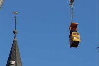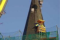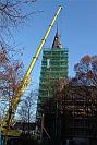 Aufgrund feuchter Holzbalken, die unter dem Kirchdach festgestellt wurden, vermutete man undichte Stellen am Turmdach. So wurde zunächst von dem auf der Turmspitze sitzenden Wetterhahn die undichte alte Kreuzkugel saniert. Auch der Schaft zum Turmhelm wurde untersucht und als undicht befunden. Mit Hilfe des Hebekorbs konnte auch dies trotz der ungewöhnlichen Höhe relativ schnell abgedichtet werden. Die Firma Blitzschutz-Graff tauschte des weiteren die veralterte Blitzschutzanlage gegen eine neue aus. Die Arbeiten konnten trotz eisiger Kälte an diesem Morgen zügig durchgeführt werden, obgleich die Herren „im Körbchen“ sicher gerne lieber einen heißen Tee getrunken hätten.