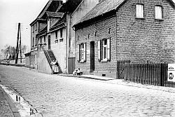 Foto um 1920 zeigt die Alte Neusser Landstraße mit Korn- und Ölmühle (links) und die Gaststätte „Deutsches Reich“ – heute Restaurant Zeradest (rechts)