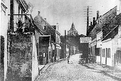 Foto um 1930 Links (vgl. Foto): Ehemals Flankenturm des Rheintores; Abbruch der Pforte im Jahre 1833. Im Turm befand sich auch die Haftzelle der Gemeinde Worringen. Ab 1878 Metzgerei Hulbert.