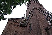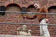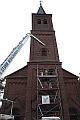 Die Aufstellung des neuen Hirten oberhalb des Kirchenportals erfolgte wegen des Feiertages erst am Pfingstdienstag, denn hierzu waren erneut ein Gerüst sowie ein kräftiger Kran notwendig. Unter Aufsicht und Mitwirkung der beiden Steinmetzmeister sowie den stolzen Blicken einiger Pfarrgemeindemitglieder, wurde der gute Hirte am Morgen des Pfingstdienstag endgültig auf seinem alten Platz befestigt und wacht nun wieder -wie sein Vorgänger seit 125 Jahren- über die Worringer Bevölkerung. Und wer den guten Hirten noch nicht kennt oder bisher nur übersehen hat, sollte im Vorbeigehen am Hauptportal der Kirche einfach einmal nach oben schauen.