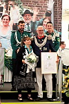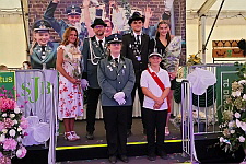 Zug der "St. Hubertus" Schützenbruderschaft 1929 und seiner Königin Nicole sowie dem Jungschützenkönig Nico I. Mohrs vom 2. Scheibenschützenzug "Voll drop ´96". Allein durch ihre Spitznamen „Hasi“ und „Möhrchen“ passen die neuen Majestäten sehr gut zusammen.